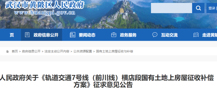 因轨道交通7号线(前川线)横店段工程建设的公共利益需要,根据《国有土地上房屋征收与补偿条例》(国务院令第590号)《湖北省国有土地上房屋征收与补偿实施办法》(省政府令第380号)和《武汉市国有土地上房屋征收与补偿实施办法》(市政府令第234号公布,第275号修订)的规定,现在房屋征收范围内公布《轨道交通7号线(前川线)横店段国有土地上房屋征收补偿方案(征求意见稿)》,公告内容如下: