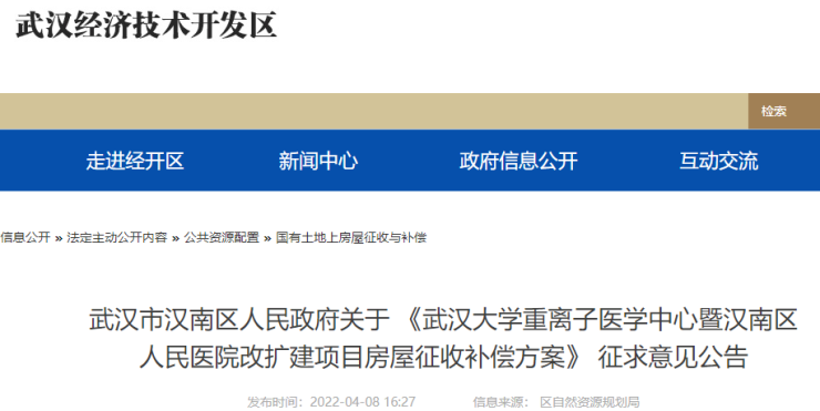 为提供高性能、高性价比重离子放疗高端设备,更好服务人民健康事业,满足人民群众多年期盼,提升纱帽片区城市功能,根据《国有土地上房屋征收与补偿条例》、《湖北省国有土地上房屋征收与补偿实施办法》和《武汉市国有土地上房屋征收与补偿实施办法》的规定,现在房屋征收范围内公布《武汉大学重离子医学中心暨汉南区人民医院改扩建项目房屋征收补偿方案(征求意见稿)》,公告内容如下: