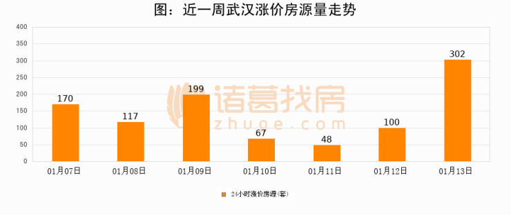 根据诸葛找房数据显示,武汉24小时涨价房源量为302套,较01月12日增加202套,环比上涨202%。与此同时,涨价房源占比小幅扩大,业主信心有所提升。