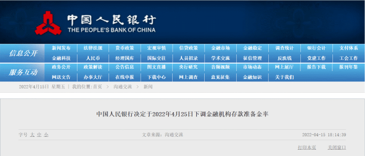 4月15日晚间,央行宣布,为支持实体经济发展,促进综合融资成本稳中有降,决定于2022年4月25日下调金融机构存款准备金率0.25个百分点(不含已执行5%存款准备金率的金融机构)。为加大对小微企业和“三农”的支持力度,对没有跨省经营的城商行和存款准备金率高于5%的农商行,在下调存款准备金率0.25个百分点的基础上,再额外多降0.25个百分点。本次下调后,金融机构加权平均存款准备金率为8.1%。