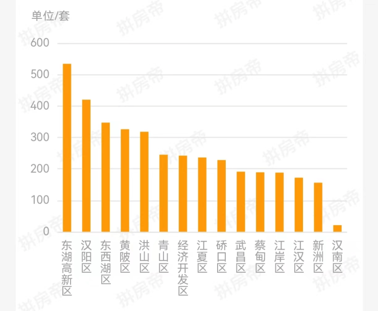 从区域来看,东湖高新区新建商品住房成交534套,排名本周第一,其次是汉阳区420套排名第二,东西湖区347套排第三。本周有9个区域成交量超过200套。