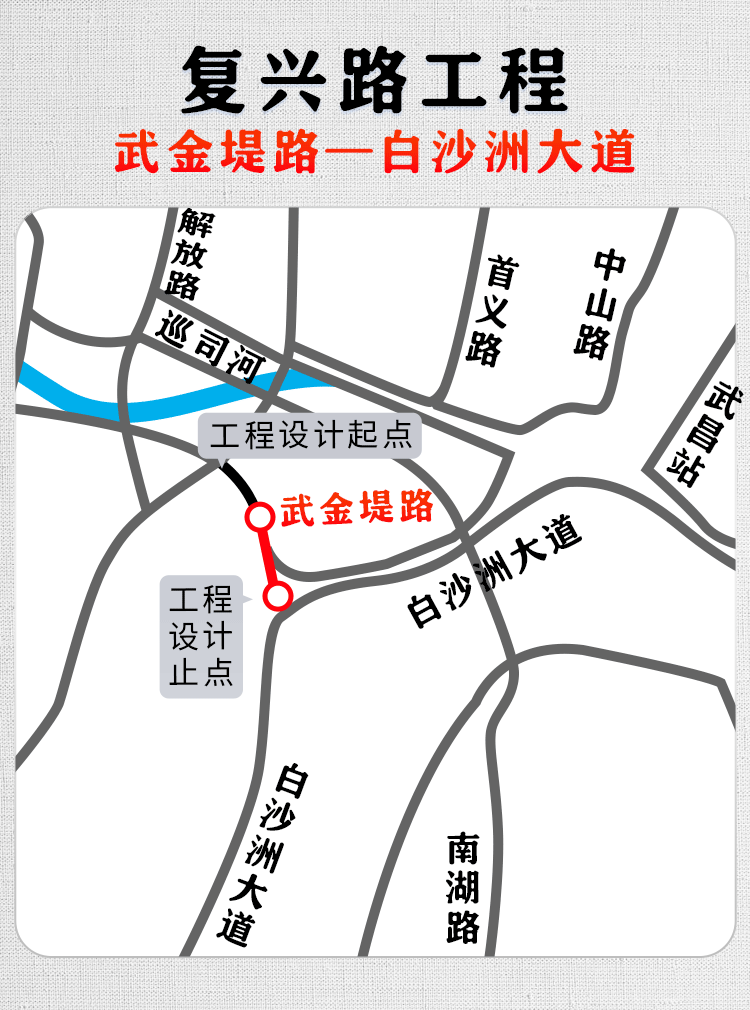 复兴路工程“武金堤路—白沙洲大道”段(图中红色部分)地理位置示意图。