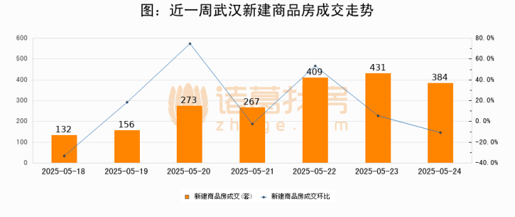 根据武汉市住房保障和房屋管理局数据显示,2025年05月24日武汉新建商品房成交384套,较昨日减少47套,环比下降10.9%