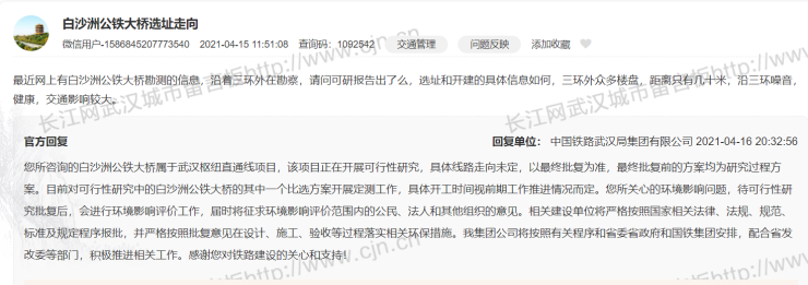 中国铁路武汉局集团有限公司回复称,该项目正在开展可行性研究,具体线路走向未定,以最终批复为准,最终批复前的方案均为研究过程方案。目前对可行性研究中的白沙洲公铁大桥的其中一个比选方案开展定测工作,具体开工时间视前期工作推进情况而定。您所关心的环境影响问题,待可行性研究批复后,会进行环境影响评价工作,届时将征求环境影响评价范围内的公民、法人和其他组织的意见。相关建设单位将严格按照国家相关法律、法规、规范、标准及规定程序报批,并严格按照批复意见在设计、施工、验收等过程落实相关环保措施。我集团公司将按照有关程序和省委省政府和国铁集团安排,配合省发改委等部门,积极推进相关工作。