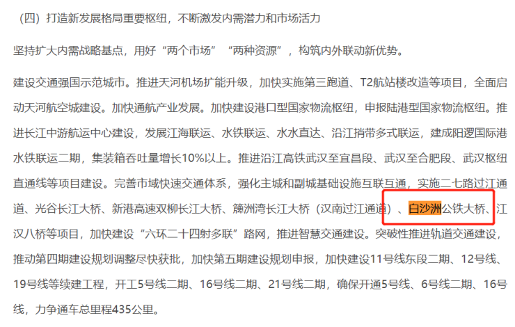 据悉,武汉白沙洲公铁大桥是西武高铁与市政道路共用桥梁,属于国家、湖北省拟开工的重大铁路项目。作为武汉枢纽直通线项目,沿江高铁也是长江经济带综合大通道的重要组成部分,对于加强东、中、西三大经济板块的交流与合作,促进沿线城市生产要素的流通,加快长江经济带经济发展,具有重要的战略意义。
