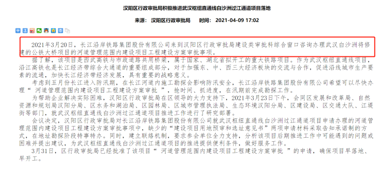 据武汉市汉阳区人民政府官网公开信息显示,2021年3月23日下午,汉阳区行政审批局会同区发展和改革局、自然资源和规划局汉阳分局、区水务和湖泊局、区园林局、区城市管理执法局、生态环境汉阳分局、区建设局、区交通大队、江堤街等部门,就武汉枢纽直通线白沙洲过江通道项目推进工作进行了研究部署。3月31日,区行政审批局已经批准了该项目“ 河道管理范围内建设项目工程建设方案审批 ”的申请,确保项目早落地、早开工。