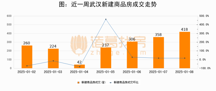 根据武汉市住房保障和房屋管理局数据显示,2025年01月08日武汉新建商品房成交418套,较昨日增加60套,环比上涨16.8%