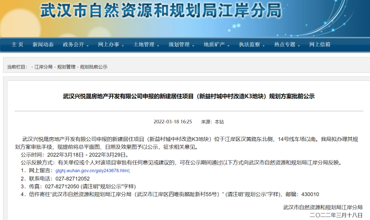 搜狐焦点“楼市快讯”报道:近日,搜狐焦点获悉,武汉市自然资源和规划局江岸分局发布了《武汉兴悦晟房地产开发有限公司申报的新建居住项目(新益村城中村改造K3地块)规划方案批前公示》(以下简称《公示》)。具体来看,新益村城中村改造K3地块位于江岸区汉黄路东北侧,14号线车场以南。
