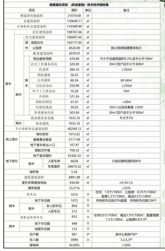 项目容积率5.24,建筑密度23.21%,地下停车位1072个(人防车位212个,非人防车位859个),非机动车停车位632个(其中地下车位数499个,地面停车位133个),规划总户数967户,绿地率30%。