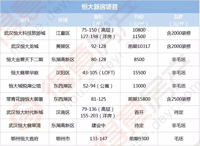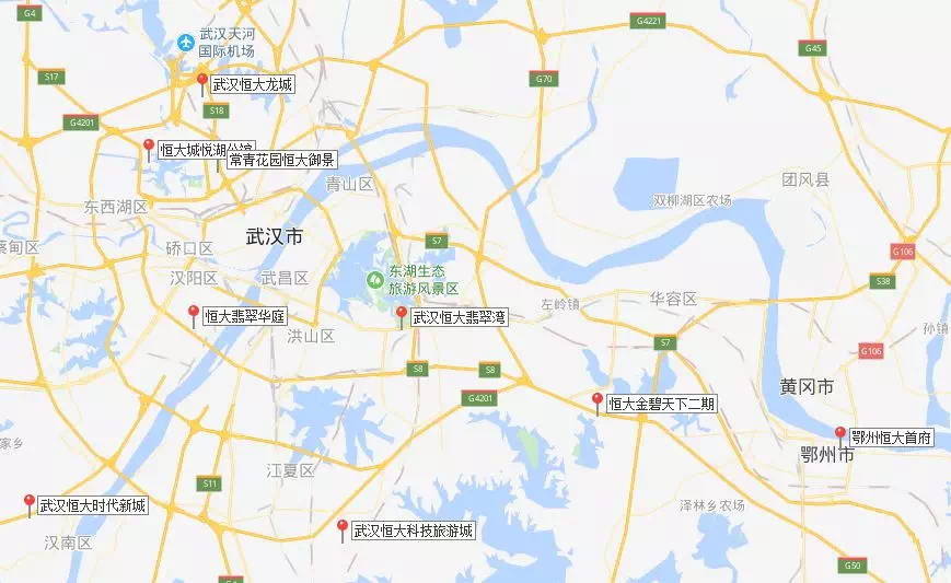 据得意房不完全统计,目前恒大在武汉有9个项目,其中:东湖高新区2个、东西湖区2个、汉阳区1个、汉南区1个、黄陂区1个、江夏1区个、鄂州1个。