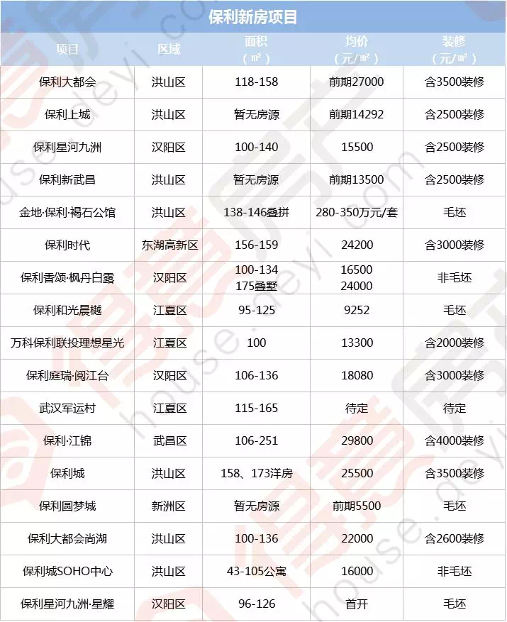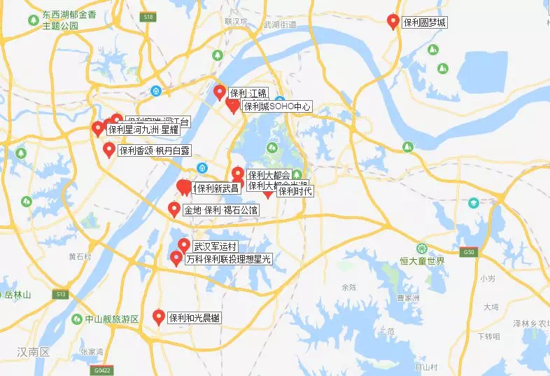 据得意房不完全统计,目前保利在武汉有17个项目,其中:东湖高新区1个、汉阳区4个、洪山区7个、江夏区3个、武昌区1个、新洲区1个。