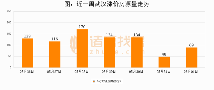 根据诸葛找房数据显示,武汉24小时涨价房源量为89套,较05月31日增加41套,环比上涨85.4%。与此同时,涨价房源占比小幅扩大,业主信心有所提升。