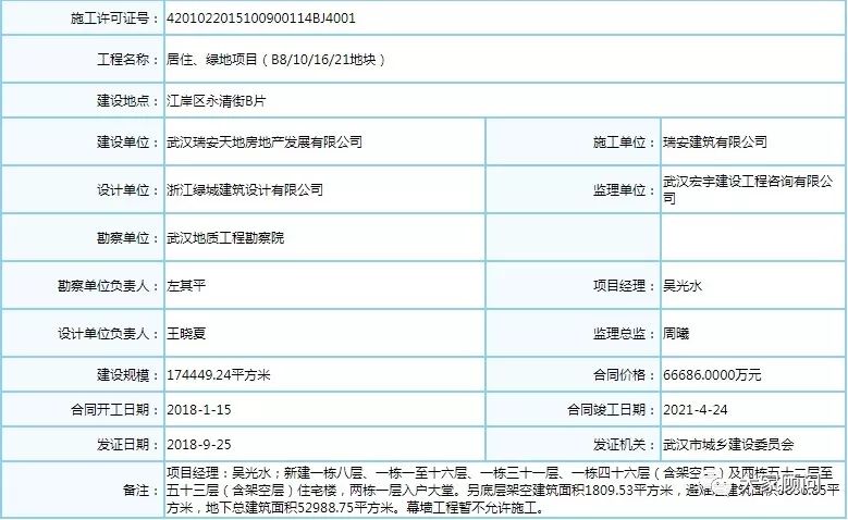 9月25日,武汉瑞安天地房地产发展有限公司开发的居住、绿地项目(B8/10/16/21地块)获施工许可证。