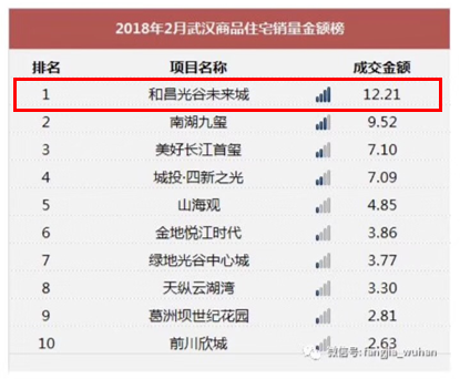 据克而瑞数据统计,2018年2月武汉商品住宅销量金额榜上,和昌光谷未来城项目以成交金额12.21亿位列榜首。由此可见和昌光谷未来城项目市场占有率优势明显,在武汉楼市受欢迎度很高。