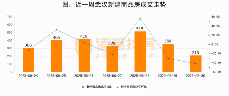 根据武汉市住房保障和房屋管理局数据显示,2025年08月30日武汉新建商品房成交210套,较昨日减少149套,环比下降41.5%