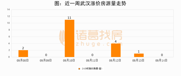 根据诸葛找房数据显示,武汉24小时涨价房源量为0套,较09月13日减少1套,环比下降100%。与此同时,涨价房源占比小幅回落,对于购房者来说是一个入市窗口期,购房者可抓住时机入市。
