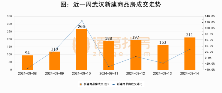 根据武汉市住房保障和房屋管理局数据显示,2024年09月14日武汉新建商品房成交211套,较昨日增加48套,环比上涨29.4%。近一周武汉新建商品房日均成交177套。09月14日单日成交211套,高于近一周平均水平19.2%。