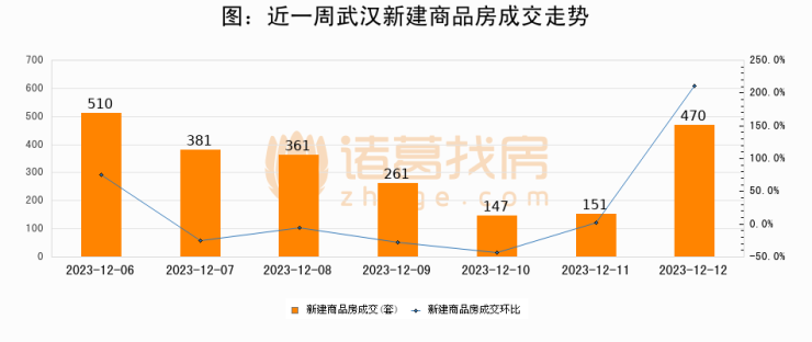 根据武汉市住房保障和房屋管理局数据显示,2023年12月12日武汉新建商品房成交470套,较昨日增加319套,环比上涨211.3%