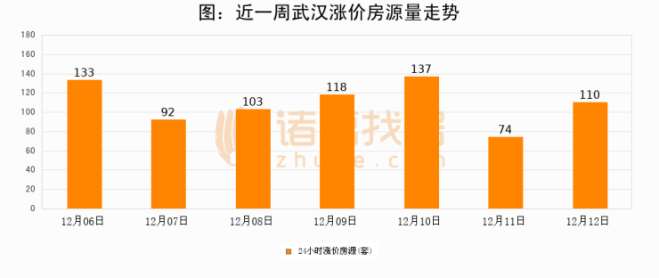根据诸葛找房数据显示,武汉24小时涨价房源量为110套,较12月11日增加36套,环比上涨48.6%。与此同时,涨价房源占比小幅扩大,业主信心有所提升。