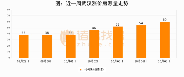 根据诸葛找房数据显示,武汉24小时涨价房源量为60套,较10月04日增加6套,环比上涨11.1%。与此同时,涨价房源占比小幅扩大,业主信心有所提升。