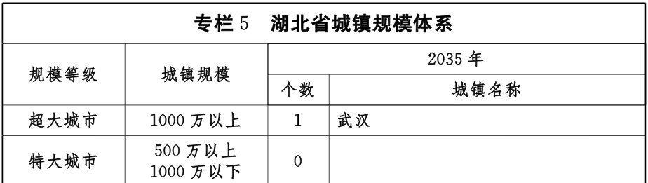 《规划》提出,到2035年,形成1个超大城市(武汉)、2个Ⅰ型大城市(襄阳、宜昌)、6个Ⅱ型大城市(黄石、十堰、荆州、荆门、孝感、黄冈)、10个中等城市(鄂州、咸宁、随州、恩施、仙桃、潜江、天门、大冶、枣阳、汉川),31个Ⅰ型小城市、25个Ⅱ型小城市的城镇规模体系。
