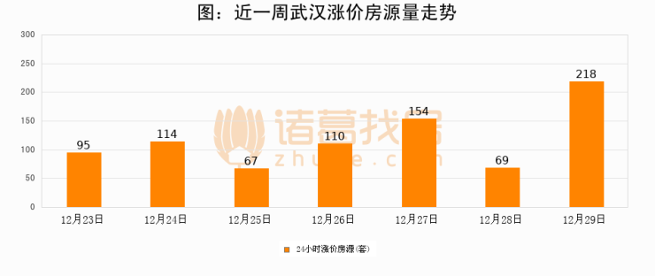 根据诸葛找房数据显示,武汉24小时涨价房源量为218套,较12月28日增加149套,环比上涨215.9%。与此同时,涨价房源占比小幅扩大,业主信心有所提升。