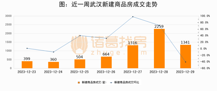 根据武汉市住房保障和房屋管理局数据显示,2023年12月29日武汉新建商品房成交1341套,较昨日减少918套,环比下降40.6%