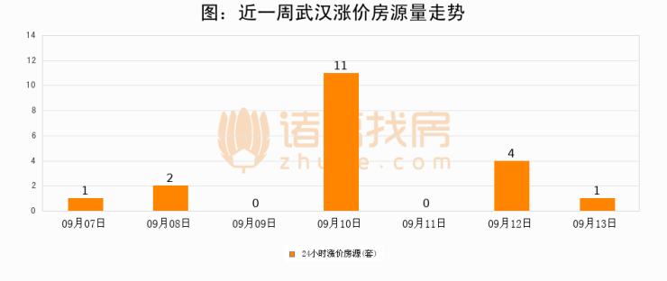 根据诸葛找房数据显示,武汉24小时涨价房源量为1套,较09月12日减少3套,环比下降75%。与此同时,涨价房源占比小幅回落,对于购房者来说是一个入市窗口期,购房者可抓住时机入市。