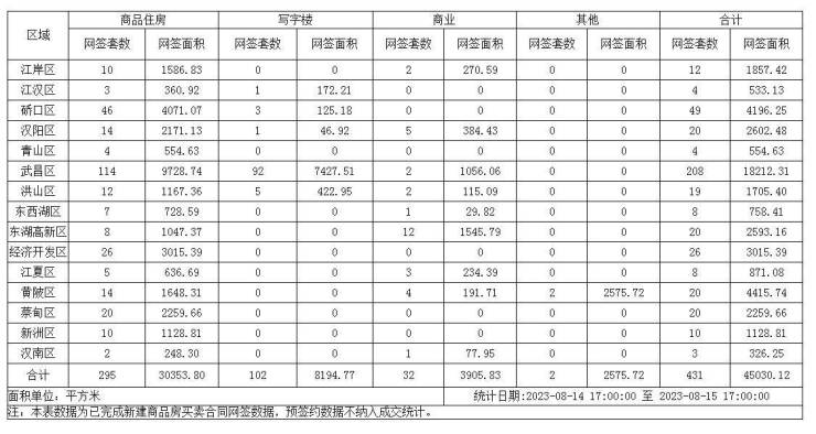 【武汉成交日报】08月15日新建商品住房成交295套