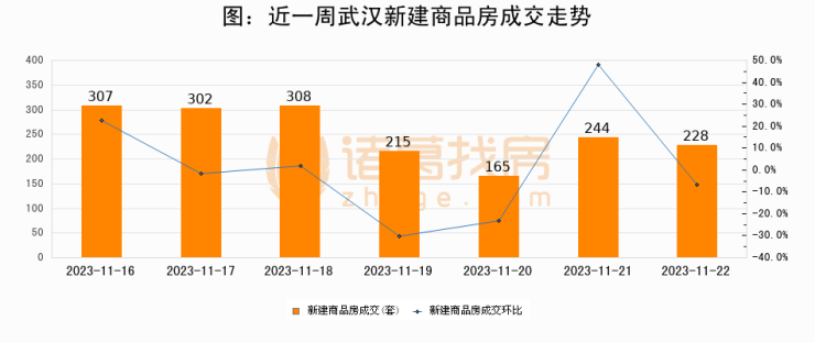 根据武汉市住房保障和房屋管理局数据显示,2023年11月22日武汉新建商品房成交228套,较昨日减少16套,环比下降6.6%