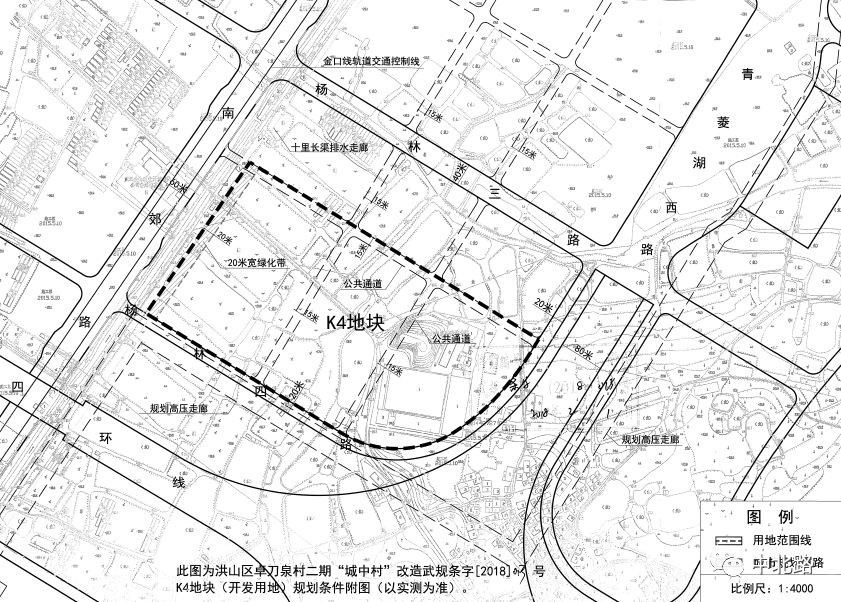 K4地块位于杨林四路与南郊路交汇处东北部(详见规划用地范围线);规划用地面积为184611平方米(含公园绿地6382平方米,以实测为准);规划用地性质为居住用地、公园绿地;土地分类为住宅用地、公园与绿地;计容建筑面积控制在622100平方米以内;容积率按计容建筑面积与用地面积比值计算;建筑密度不大于25%;建筑高度不高于120米;绿地率按《武汉市城市绿化条例》执行;国有建设用地使用权出让年限为住宅用地70年。