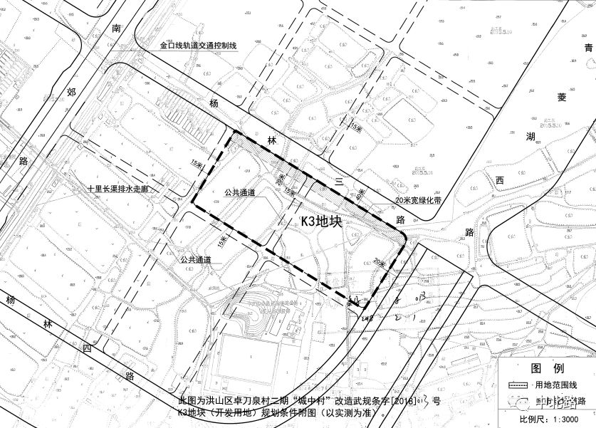 K3地块位于杨林三路与青菱湖西路交汇处西南部(详见规划用地范围线);规划用地面积为59891平方米(含公园绿地7551平方米,以实测为准);规划用地性质为居住用地、公园绿地;土地分类为住宅用地、公园与绿地;计容建筑面积控制在201800平方米以内;容积率按计容建筑面积与用地面积比值计算;建筑密度不大于25%;建筑高度不高于120米;绿地率按《武汉市城市绿化条例》执行;国有建设用地使用权出让年限为住宅用地70年。