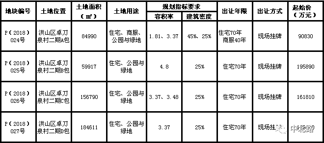 2、P(2018)024号、P(2018)025号、P(2018)026号、P(2018)027号地块分别对应洪山区卓刀泉村二期A包、B包、C包以及D包0微信公众号中北路合计其土地总面积为48.63万方,总建面超160万方,而总起拍价达63.533亿。