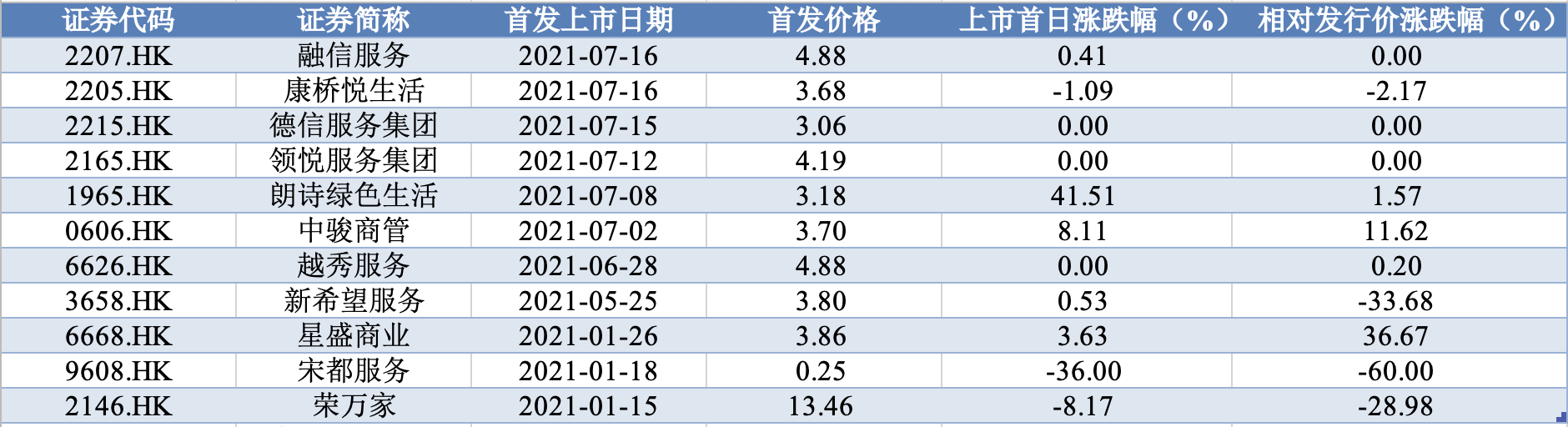 2021年一开年,物业公司上市的闸门也同步开启。荣万家、宋都服务、星盛商业在1月份挂牌;5月、6月,港交所迎来了新希望服务、越秀服务;7月,中骏商管、朗诗绿色生活、领悦服务、德信服务集团、融信服务、康桥悦生活则集中上市。