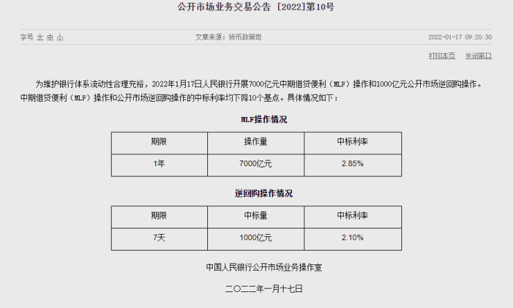 1月17日消息,搜狐焦点获悉,人民银行发布公告称,为维护银行体系流动性合理充裕,当天开展7000亿元中期借贷便利(MLF)操作和1000亿元公开市场逆回购操作。中期借贷便利(MLF)操作和公开市场逆回购操作的中标利率均下降10个基点。