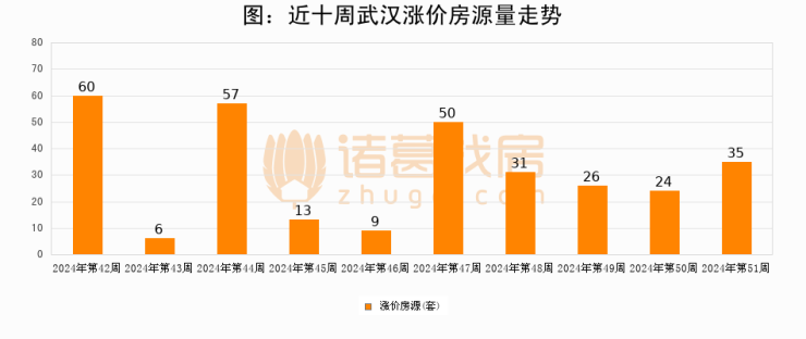 从调价房源来看,第52周武汉涨价房源35套,较上周上涨45.8%。与此同时,52周涨价房源占比提升0.32个百分点,业主信心持续恢复。