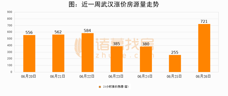 根据诸葛找房数据显示,武汉24小时涨价房源量为721套,较06月25日增加466套,环比上涨182.7%。与此同时,涨价房源占比小幅扩大,业主信心有所提升。
