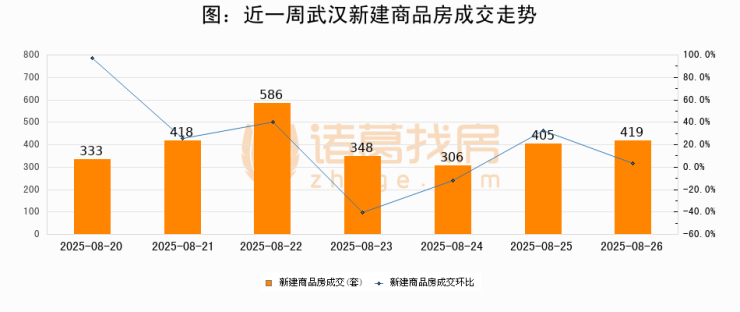 根据武汉市住房保障和房屋管理局数据显示,2025年08月26日武汉新建商品房成交419套,较昨日增加14套,环比上涨3.5%