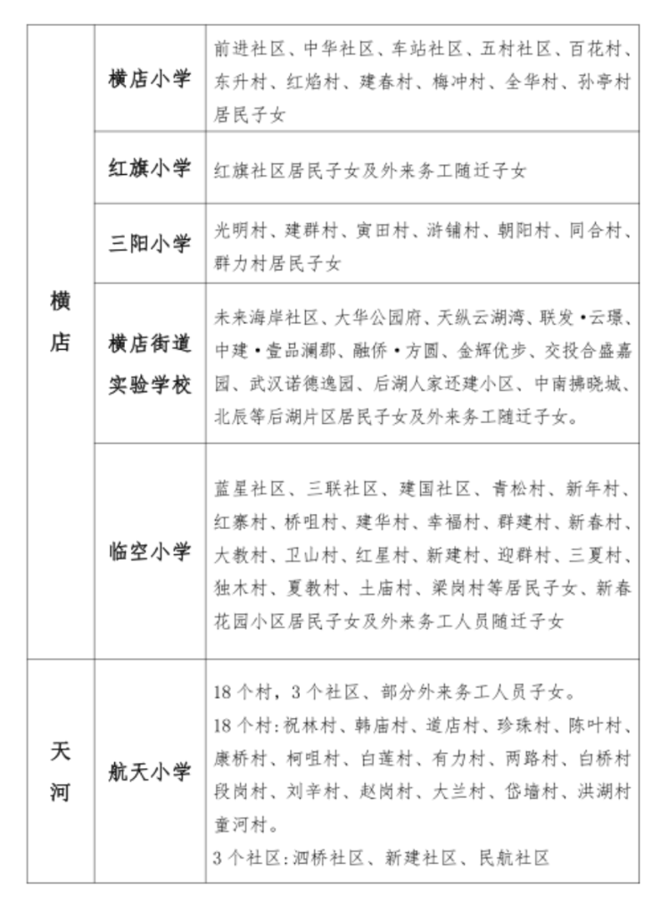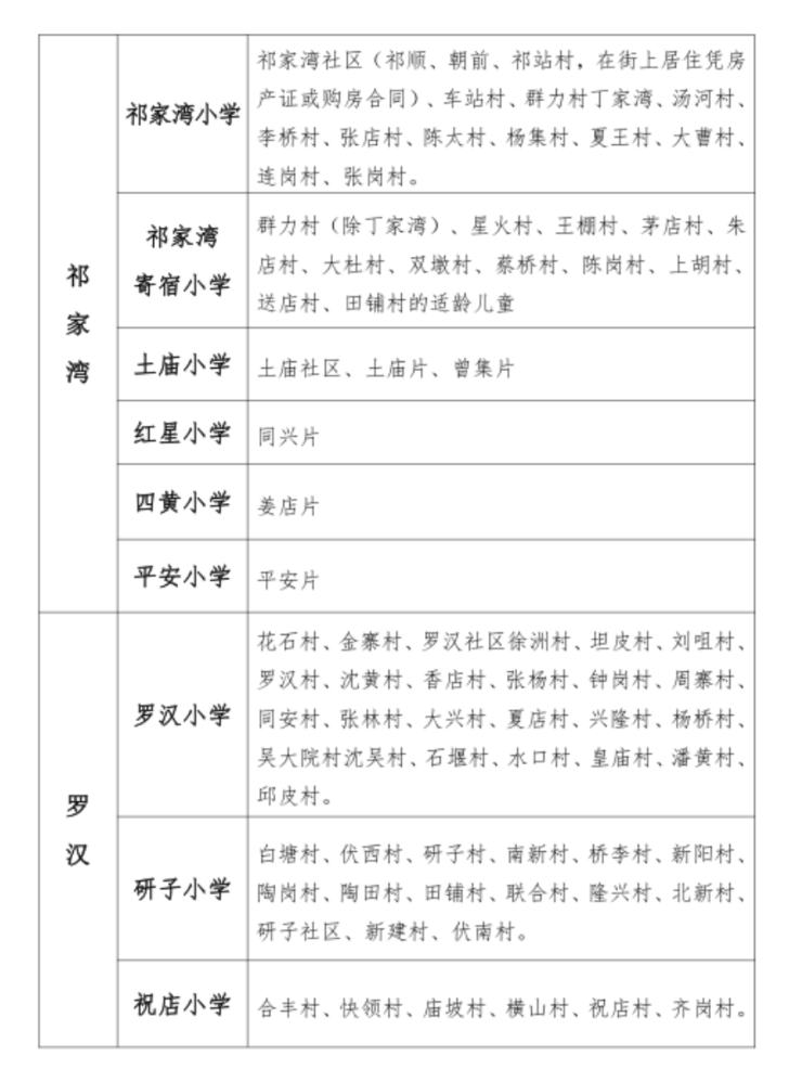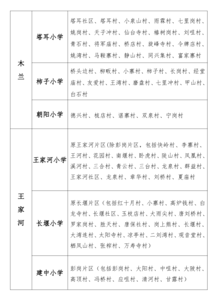 2022年汉阳区义务教育段公办学校对口服务范围一览表