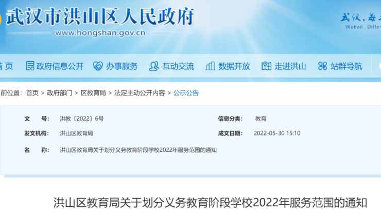 洪山区教育局关于划分义务教育阶段学校2022年服务范围的通知