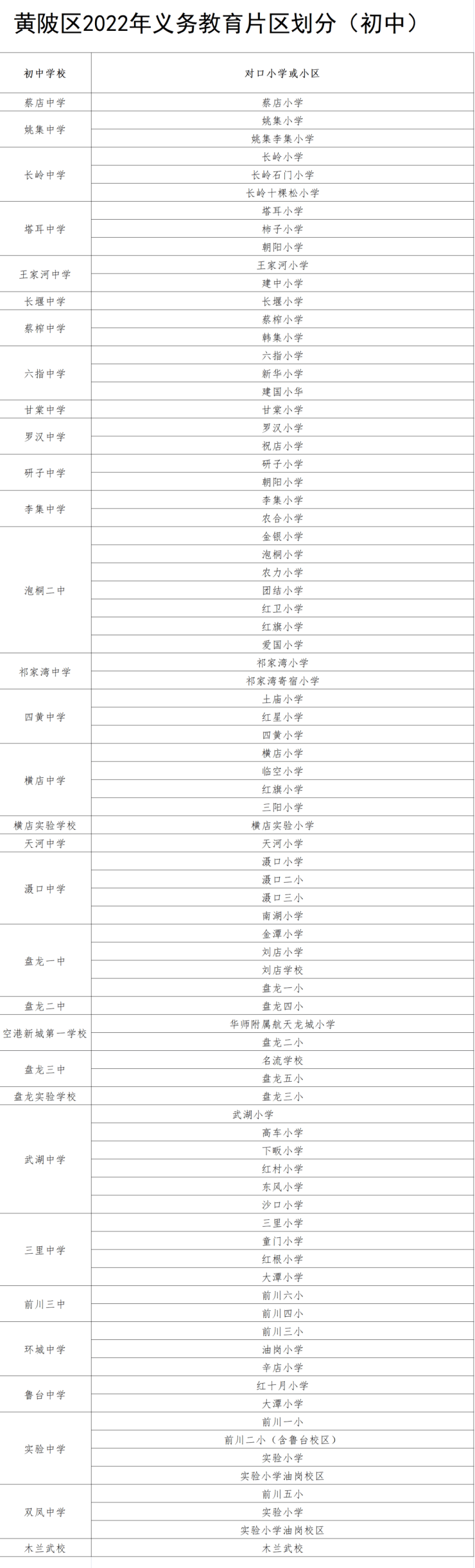 ➤ 黄陂区2022年义务教育片区划分(初中):