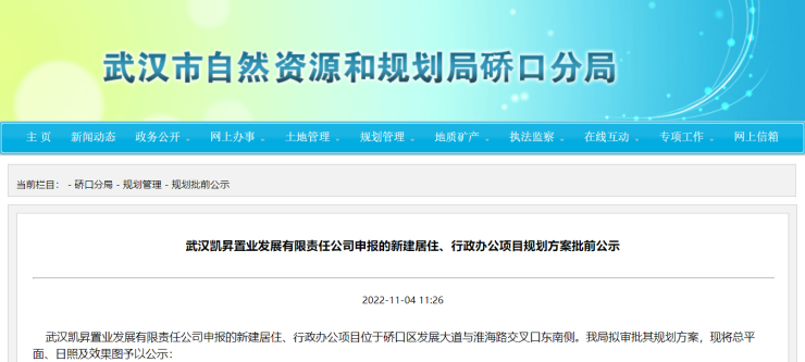 搜狐焦点“楼市快讯”报道:近日,武汉市自然资源和规划局硚口分局发布了《武汉凯昇置业发展有限责任公司申报的新建居住、行政办公项目规划方案批前公示》(以下简称《公示》)。《公示》显示,该项目位于硚口区发展大道与淮海路交叉口东南侧,武汉CBD的西北角。根据此前备案公示披露,该项目或命名为凯德淮海壹号,总投资金额35亿。