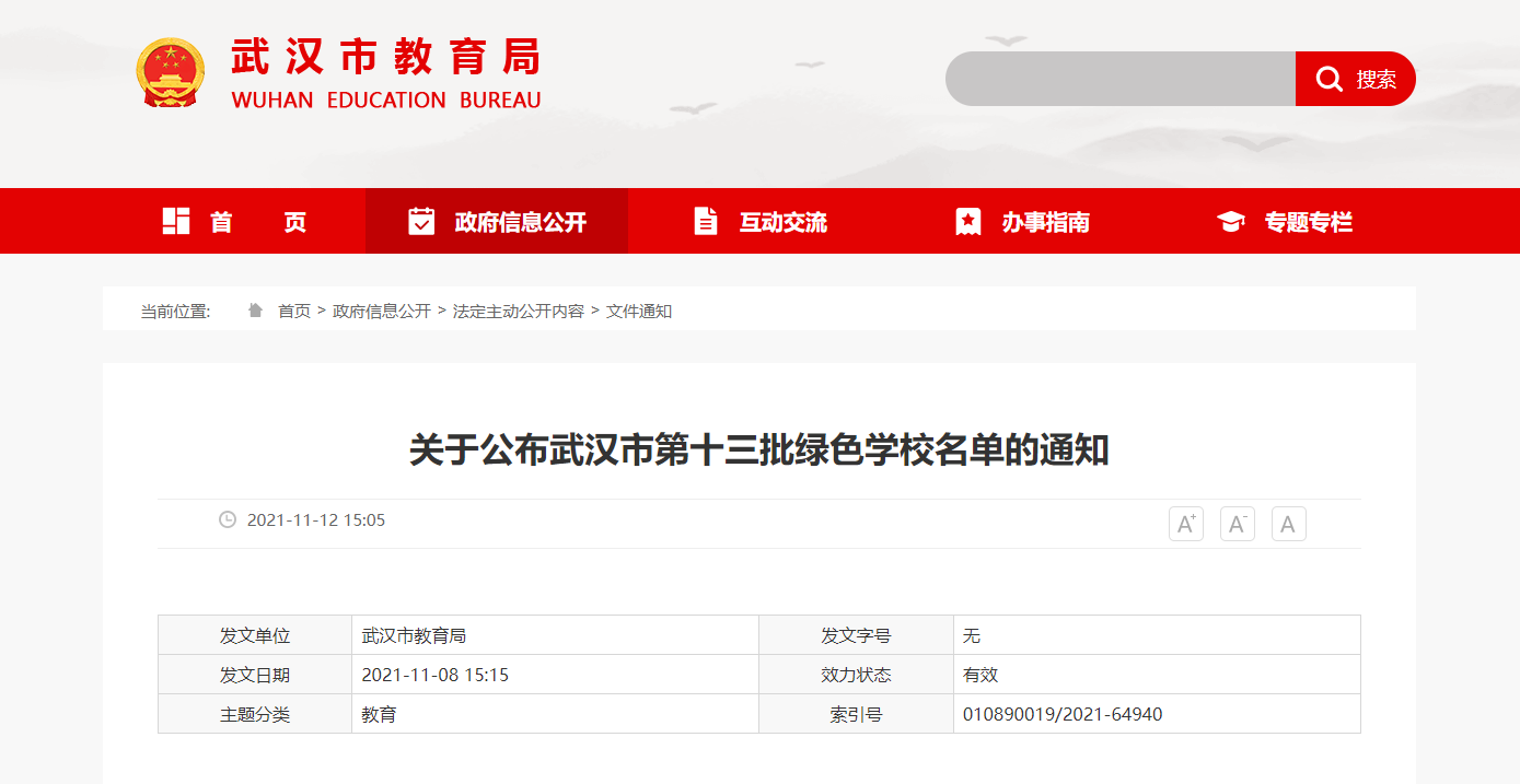 11月16日消息,搜狐焦点获悉,近日,武汉市教育局官网发布了关于公布武汉市第十三批绿色学校名单的通知。