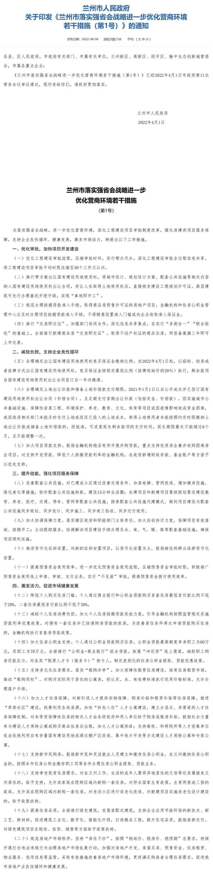 4月6日消息,搜狐焦点从兰州市人民政府官网获悉,兰州市人民政府发布了《兰州市落实强省会战略进一步优化营商环境若干措施(第 1 号)》的通知。