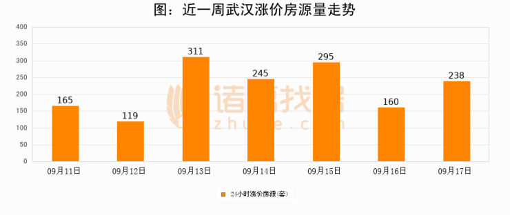 根据诸葛找房数据显示,武汉24小时涨价房源量为238套,较09月16日增加78套,环比上涨48.8%。与此同时,涨价房源占比小幅扩大,业主信心有所提升。
