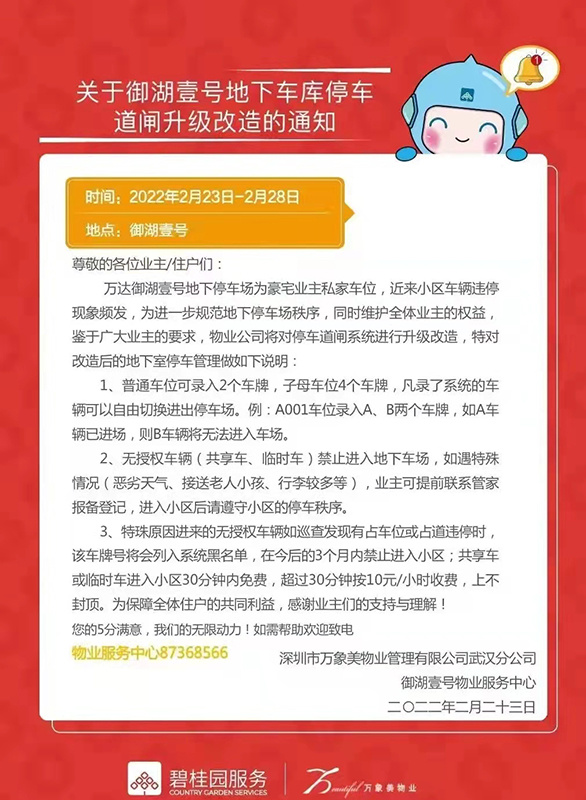 近日,万达御湖壹号物业服务中心发布了一则《关于御湖壹号地下车库停车道闸升级改造的同时通知》(以下简称《通知》)。《通知》做出了以下三点说明: