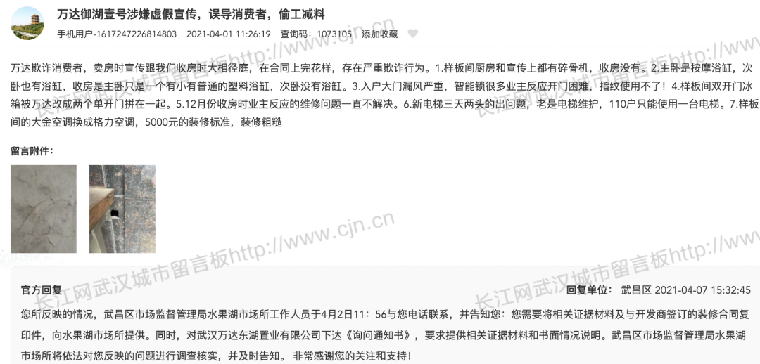 早在2021年4月份,就有业主在城市留言板投诉万达御湖壹号涉嫌虚假宣传,主要涉及收房的装修问题。5000元的装修标准,装修粗糙,这也是精装房中经常会出现的问题: