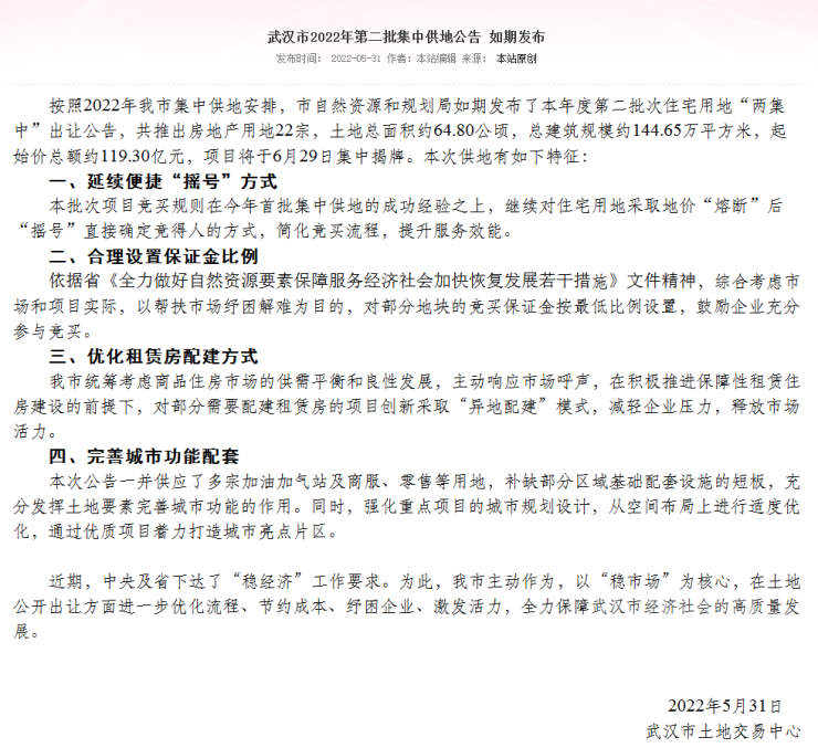 六月一开场,全国的土地市场都进入了火热状态:北京、上海等一线城市开始土拍;武汉卡着最后的时间节点,在五月最后一天发布了2022年第二批供地名单。
