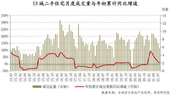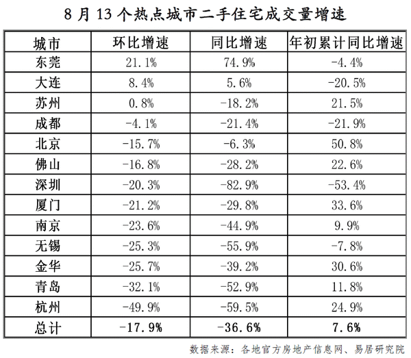上海易居房地产研究院近日发布的《热点城市二手住宅市场报告》显示,8月份其监测的13个城市二手住宅成交量约为5.7万套,环比下跌17.9%,同比大跌36.6%,年初累计成交量同比增速为7.6%。