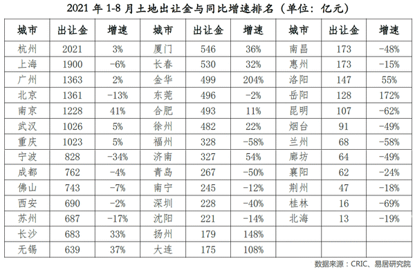 分城市来看,热点城市土地出让金收入继续走高,但增速下降,冷门城市依旧平淡。报告显示,1-8月份40城土地出让金排名前5的城市分别为杭州、上海、广州、北京和南京,其土地出让金总额分别为2021、1900、1363、1361和1228亿元,但同比增速已经陆续下降,北京和上海更是出现了负增长的现象。排名靠前的城市,主要以一二线城市为主。其中,杭州和上海1-8月的土地出让金仍大幅先进其他城市。三四线城市中,佛山和无锡的土地出让金较高,金华主要受义乌楼市火爆影响,土地出让金较去年同期增长204%。